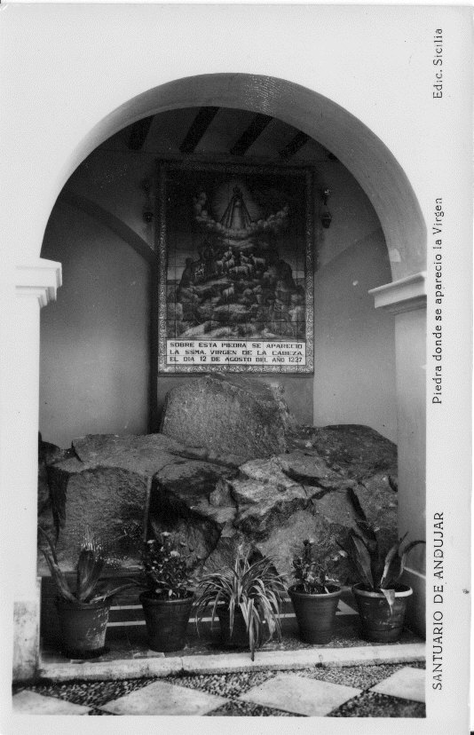 Fotografía que será de los años cincuenta, donde se ve el patio de la aparición de la Virgen de la Cabeza con un cuadro de azulejos que posiblemente será de Bartolomé Herrera, aunque sería bueno que alguien con más datos nos informara sobre la autoría del mismo.